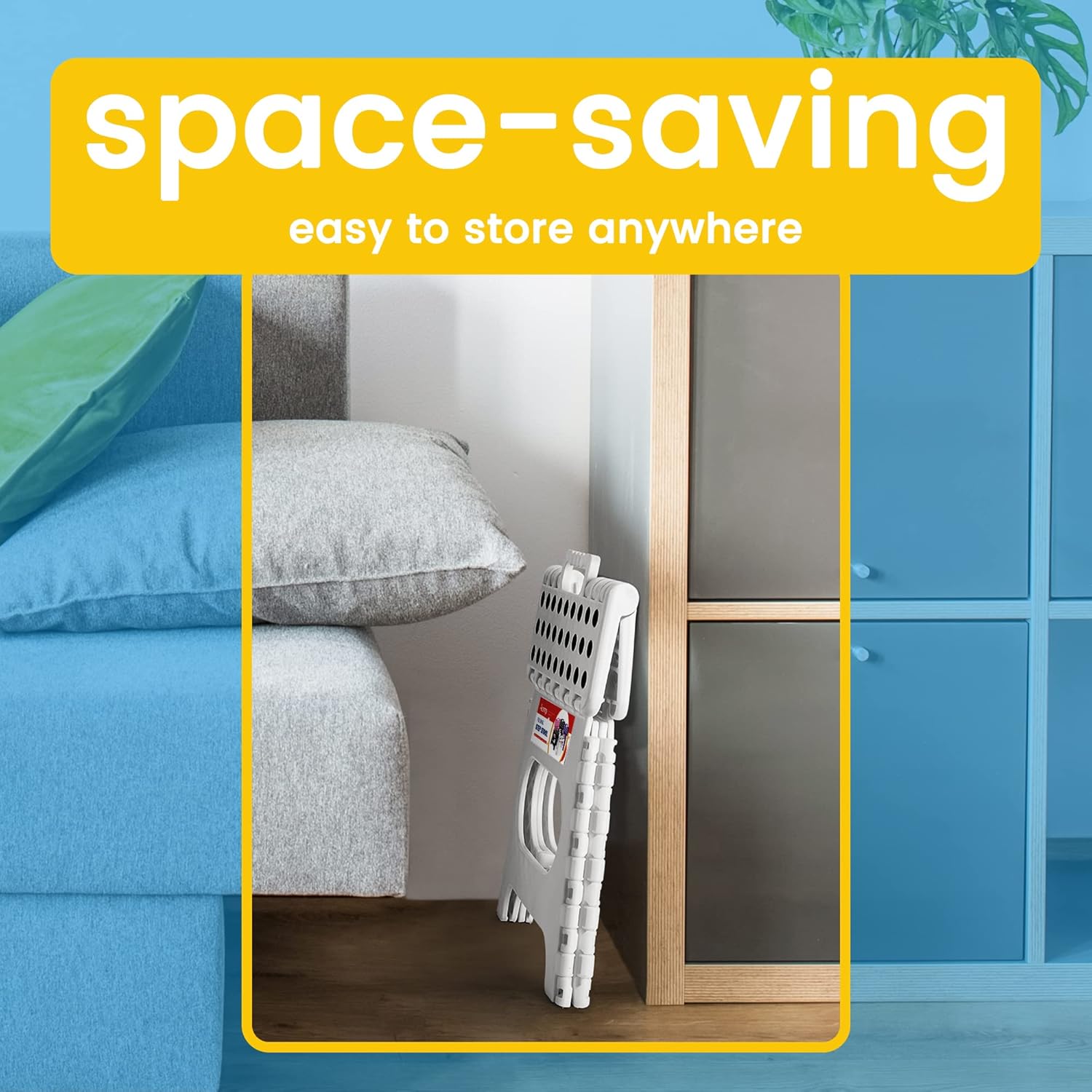 • ANTI SLIP - Special rubber dots on the surface and anti-slip black rubber strap on each foot for maximum foot grip and gives amazing comfort, preventing slippage. Unique, grip-dot textured surface makes the folding step stool safe for everyone. This safety features making the step stool great for multipurpose uses i.e. kitchen, bathroom, dining room, office, garden, camping, fishing and more.