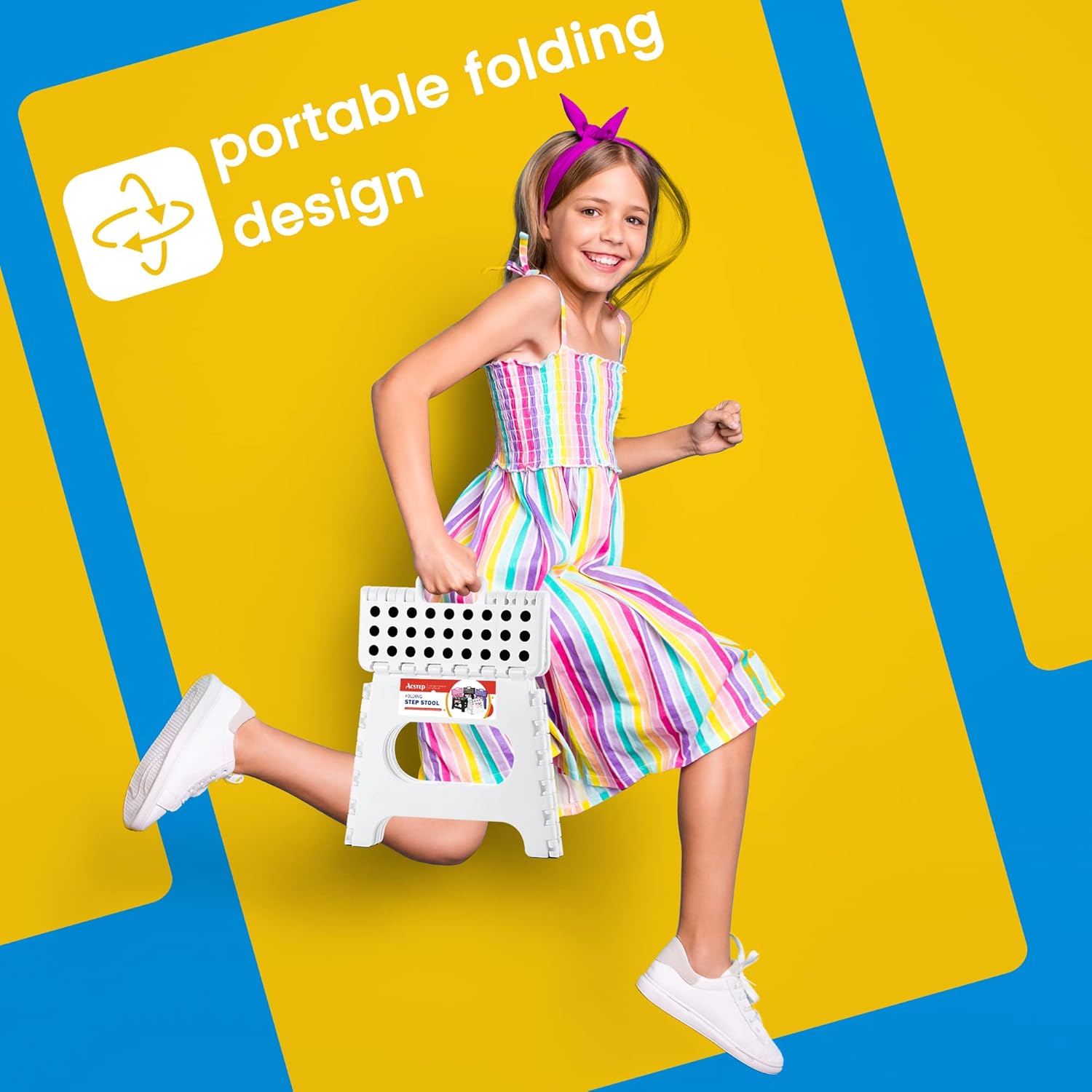 • CARRYING HANDLE - Ergonomic carrying handle is designed for easy folding and carrying. Just lift the handle, it will fold easily and quickly in a split second with only one hand. The step stool’s handle magically appears when the stool is folded flat. Allowing you comfortably carry it around so they can place it where they need it.